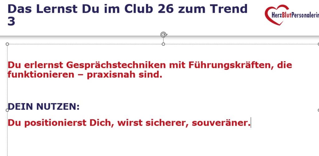 Ich vertrete die Marke Herzblutpersonalerin© und bilde Personalverantwortliche des Mittelstands kontinuierlich weiter.